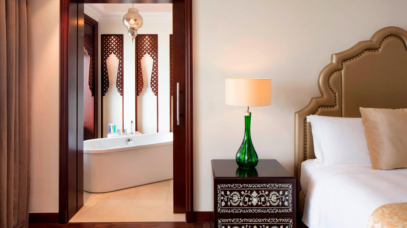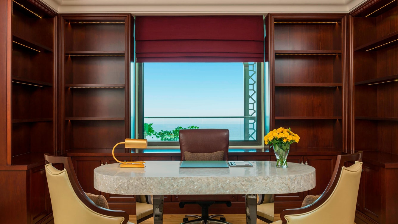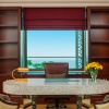 Спальня с двуспальной кроватью king-size, отдельная гостиная комната с диваном, обеденным и письменным столами (есть дверь между комнатами), ванная комната с ванной и душем, гостевой туалет, балкон, вид на залив или море;