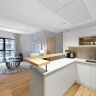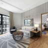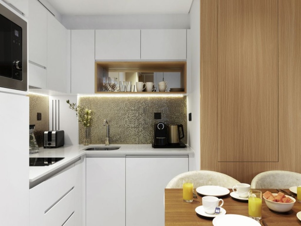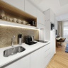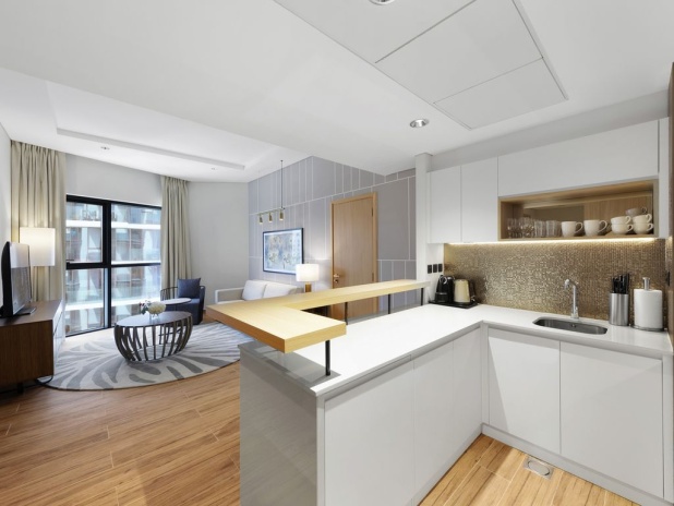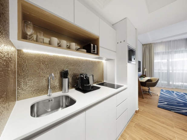 Открытая планировка номера, двуспальная кровать king-size или 2 односпальные кровати, полностью оборудованная кухня, ванная комната с душем, вид на город;