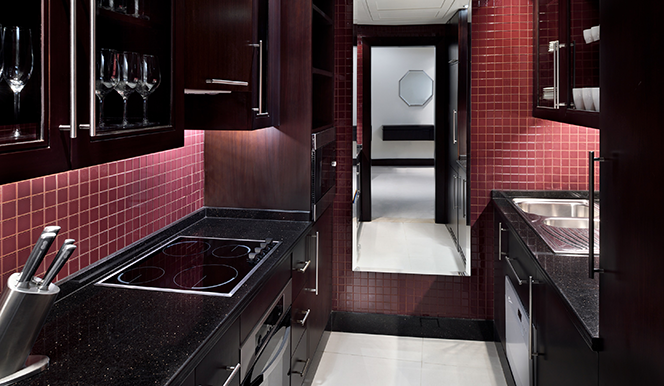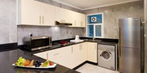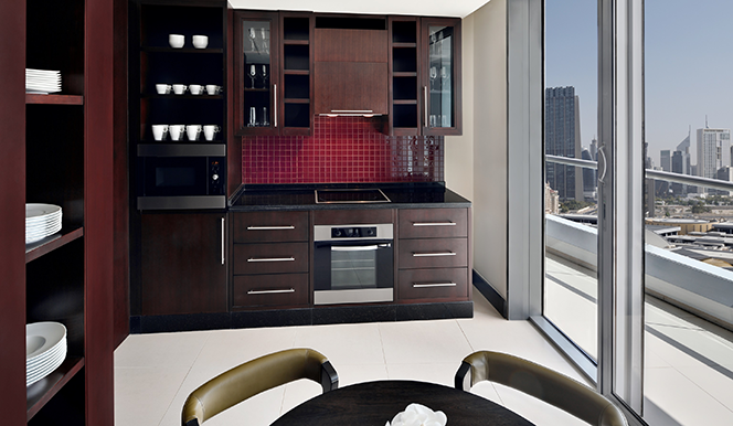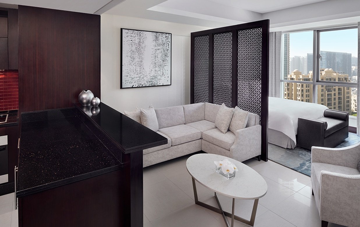 Находятся на 15-47 этажах, двуспальная кровать king-size, зона гостиной с диваном, ванная комната с душем, кухня, вид на город или Business Bay, кухонная утварь, стиральная машина;