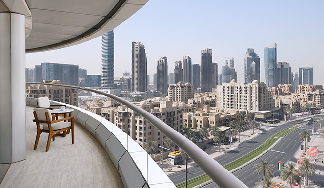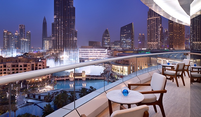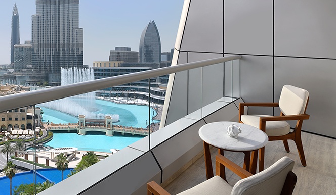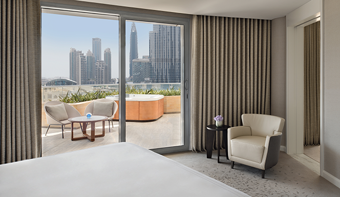 Спальня с двуспальной кроватью king-size, отдельная гостиная комната, зона гардеробной со встроенным шкафом и туалетным столиком, ванная комната с ванной и душем, эксклюзивный доступ в клубный лаунж, терраса с джакузи, трансфер из/в международны аэропорт Дубая, вид на Burj Khalifa или фонтаны, бесплатные услуги глажки: 1 рубашка и 1 костюм за весь период проживания;