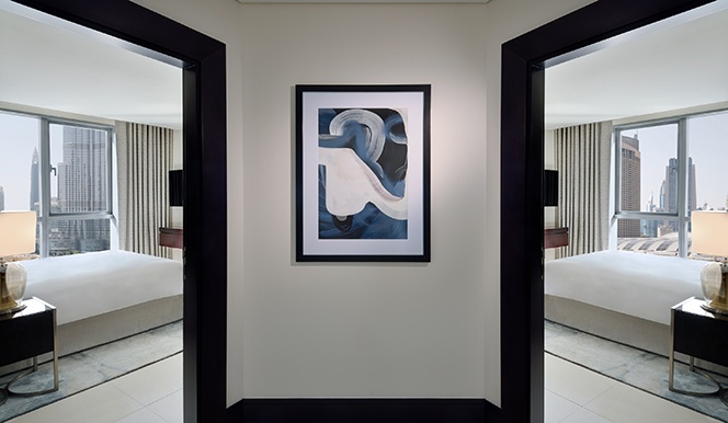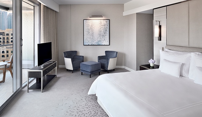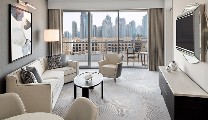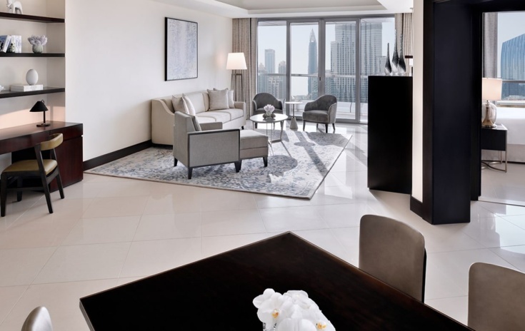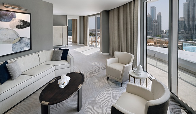 Спальня с двуспальной кроватью king-size, отдельная гостиная комната с диваном и обеденным стлом, зона гардеробной со встроенным шкафом и туалетным столиком, ванная комната с ванной и душем, эксклюзивный доступ в клубный лаунж, эксклюзивный вид на Burj Khalifa или фонтаны, трансфер из/в международный аэропорт Дубая, бесплатные услуги глажки: 1 рубашка и 1 костюм за весь период проживания;