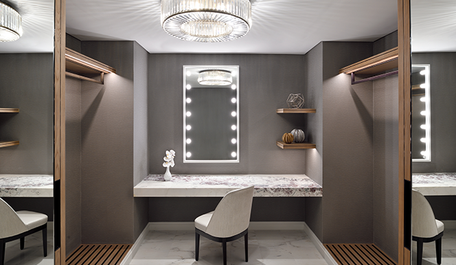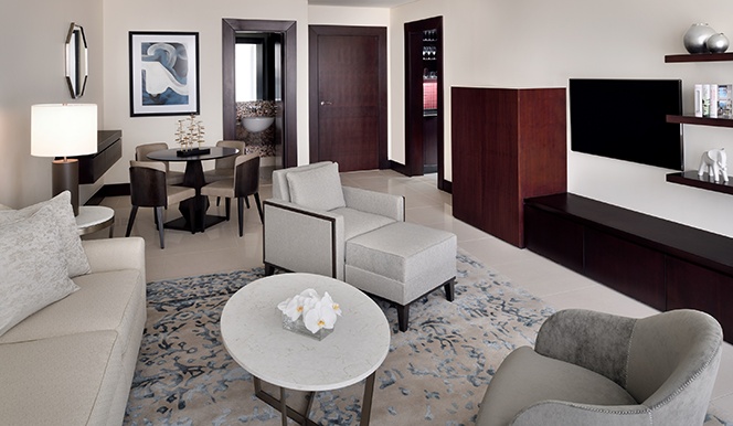 Спальня с двуспальной кроватью king-size, отдельная гостиная комната, зона гардеробной со встроенным шкафом и туалетным столиком, ванная комната с ванной и душем, эксклюзивный доступ в клубный лаунж, терраса с джакузи, трансфер из/в международны аэропорт Дубая, бесплатные услуги глажки: 1 рубашка и 1 костюм за весь период проживания;