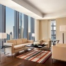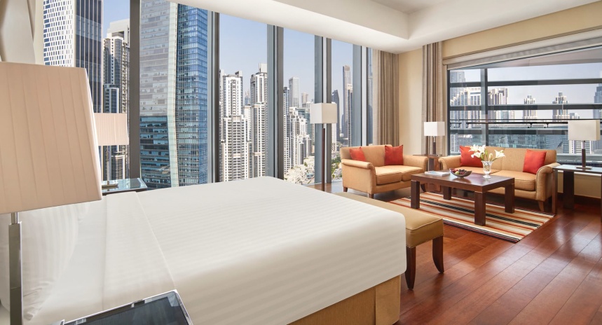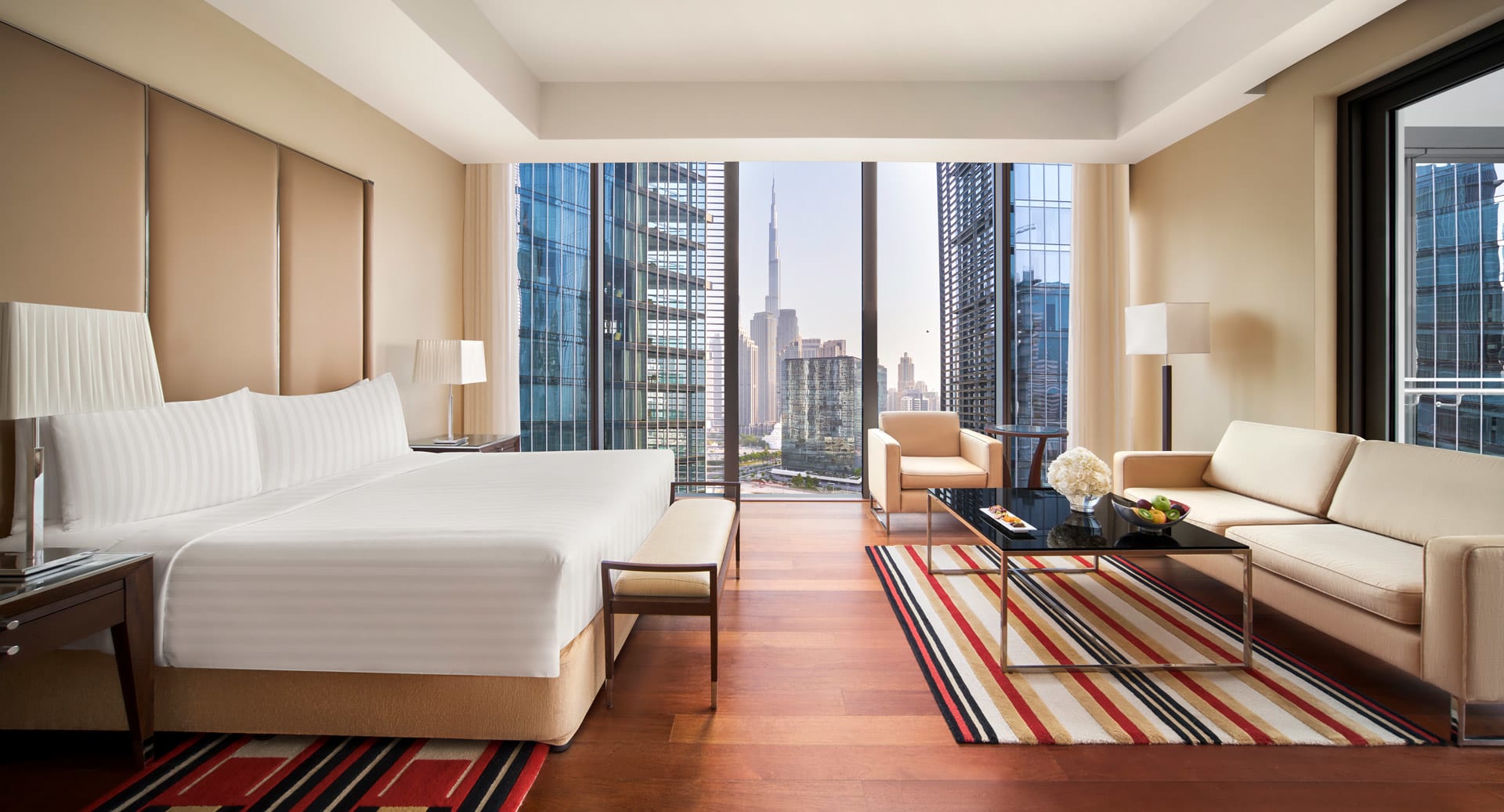 Спальня с двуспальной кроватью king-size, отдельная гостиная комната с диваном, обеденной зоной и письменным столом, окна от пола до потолка, ванная комната с ванной и душем, балкон, вид на башню Burj Khalifa;