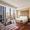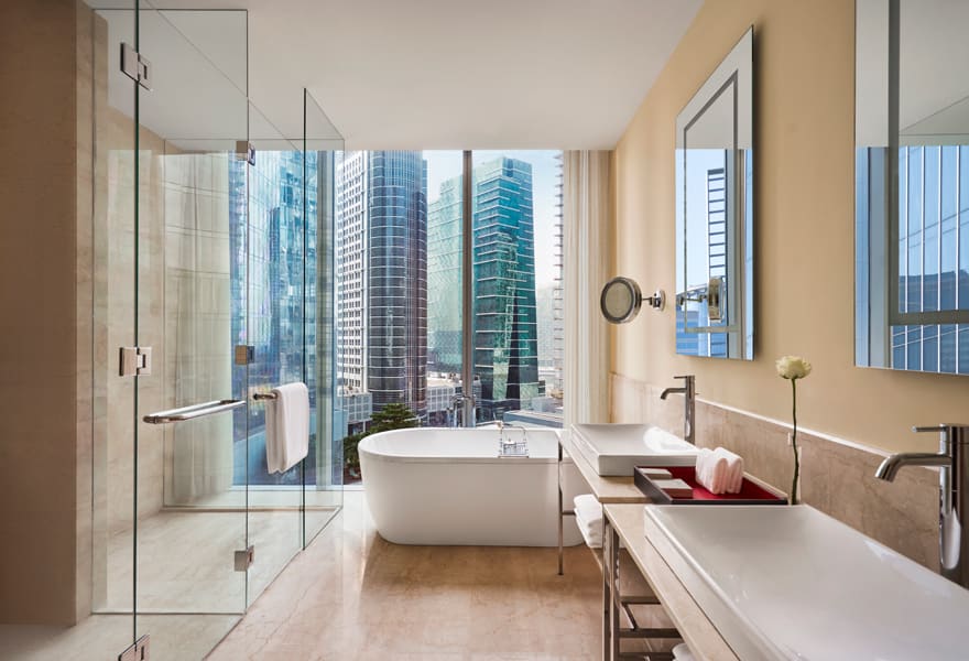 Двуспальная кровать king-size или 2 односпальные кровати, гостиная зона с диваном, окна от пола до потолка, ванная комната с ванной  душем, вид на город;