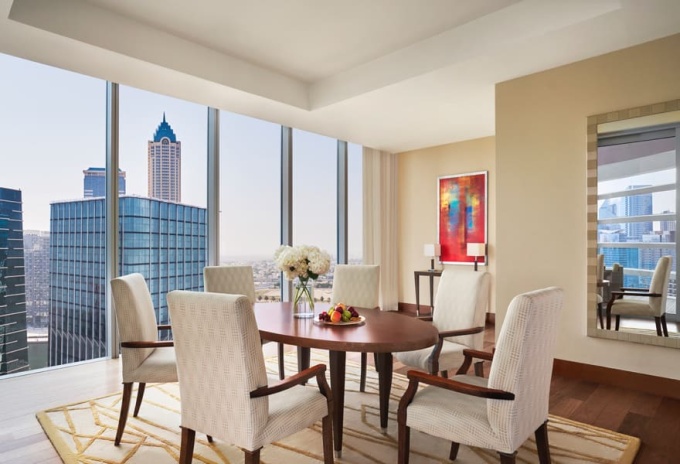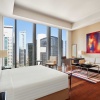 Спальня с двуспальной кроватью king-size, отдельная гостиная комната с диваном и обеденным столом, ванная комната с ванной и душем, окна от пола до потолка, балкон, вид на город и башню Burj Khalifa;