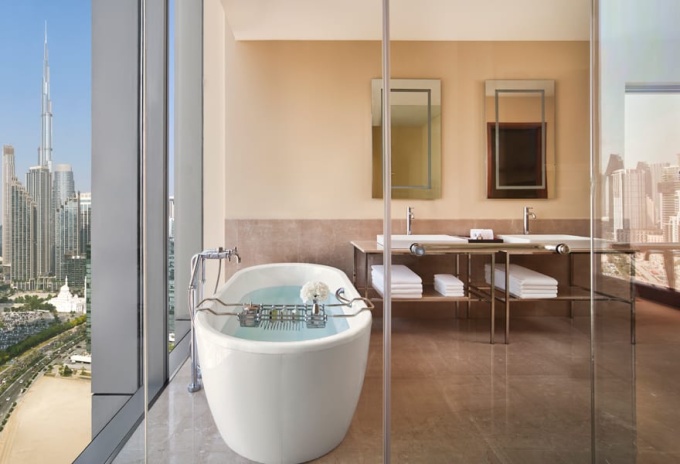 Двуспальная кровать king-size или 2 односпальные кровати, гостиная зона с диваном, окна от пола до потолка (в ванной комнате тоже панорамные окна), ванная комната с ванной, вид на башню Burj Khalifa;