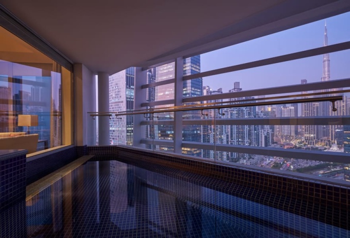 На верхнем этаже, спальня с двуспальной кроватью king-size, отдельная гостиная комната с диваном, обеденным столом, ванная комната с ванной и душем, гостевой туалет, небольшой персональный бассейн на крытом балконе, вид на башню Burj Khalifa;