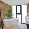 Двуспальная кровать king-size, гостиная зона с диваном-софа, ванная комната с ванной и душем, частный сад, вид на пляж;