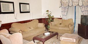 Спальня с двуспальной кроватью king-size, отдельная гостиная комната с диваном, ванная комната с ванной и душем, прихожая, гостевой туалет, балкон в некоторых номерах (номера с балконом расположены на 7 этаже), вид на фонтаны;