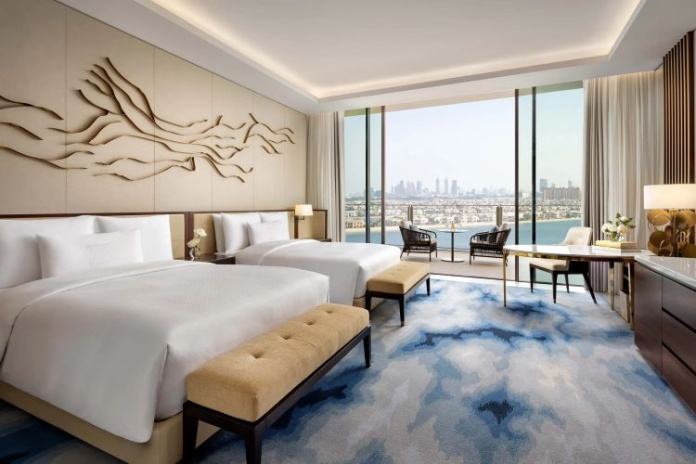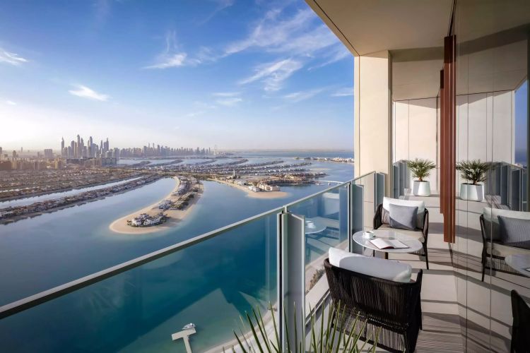 2 двуспальные кровати queen-size, гардеробная, ванная комната с ванной и душем, меблированный балкон 9 м² (размер балкона может варьироваться в зависимости от расположения номера), вид на Пальму и горизонт Дубая, есть смежные номера с Palmscape King;