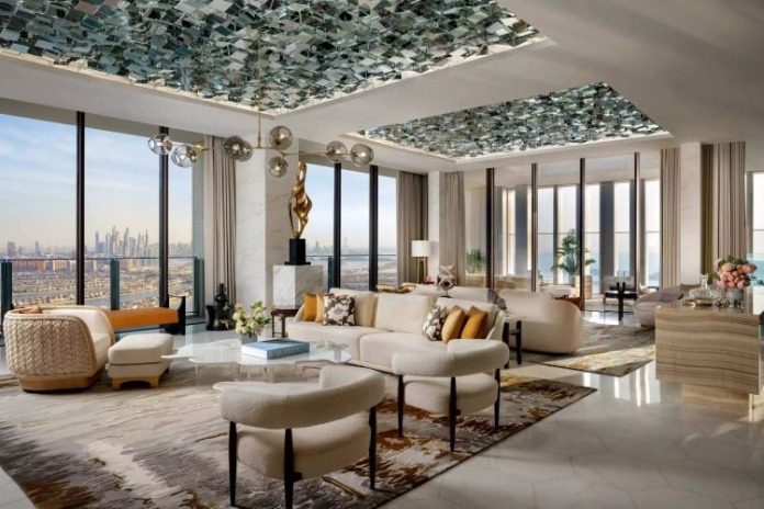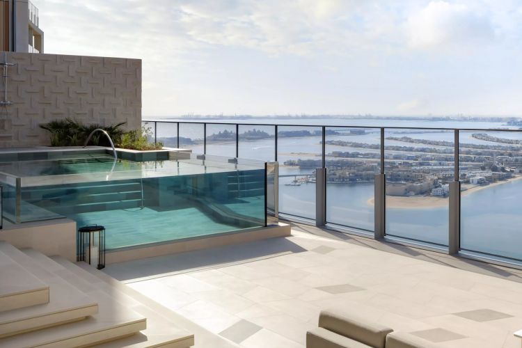4 спальни: 3 двуспальные кровати king-size и 2 двуспальные кровати queen-size, возможна дополнительная кровать, отдельная гостиная комната, обеденная зона, гардеробная, парная, кухня, гостевая ванная комната, библиотека, терраса 476 м², на террасе: персональный бассейн infinity, вид на Аравийское море, Пальму и горизонт Дубая, услуги персонального батлера, круглосуточно услуги электронного дворецкого.