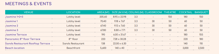 • крытые и открытые конференц-пространства: Jasmine 1 (70,4 м²) на 60 человек, Jasmine 2 (67,4 м²) на 60 человек, Jasmine 3 (67,8 м²) на 60 человек, терраса Jasmine (190 м²) на 180 человек, терраса на 8 этаже (220 м²) на 220 человек, терраса при ресторане Sands (138 м²) на 140 человек, пляжная зона (5600 м²) на 3000 человек, см.характеристики;