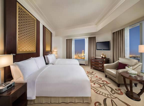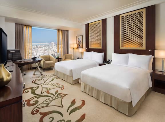 2 двуспальные кровати, гостиная зона с креслами или софа-диваном, ванная комната с ванной и душем, вид на город;