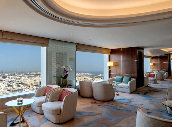 Спальня с двуспальной кроватью king-size, отдельная гостиная комната с диваном, обеденным столом, ванная комната с ванной и душем, панорамный вид на океан, с доступом в Executive Lounge на 24 этаже, план номера;