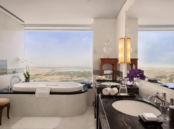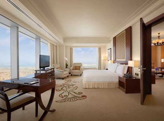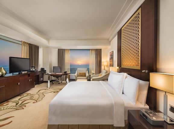 Угловой номер на верхних этажах с 24 по 35, двуспальная кровать king-size, гостиная зона с креслами или софа-диваном, ванная комната с ванной и душем, панорамный вид на океан;