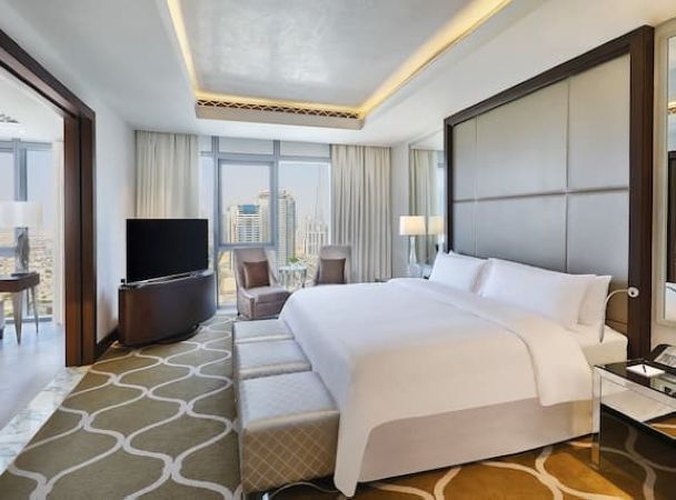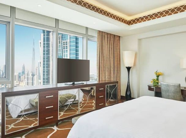 Двуспальная кровать king-size, ванная комната с отдельной ванной и душевой кабиной, окна от пола до потолка, вид на небоскрёб Бурдж Халифа;