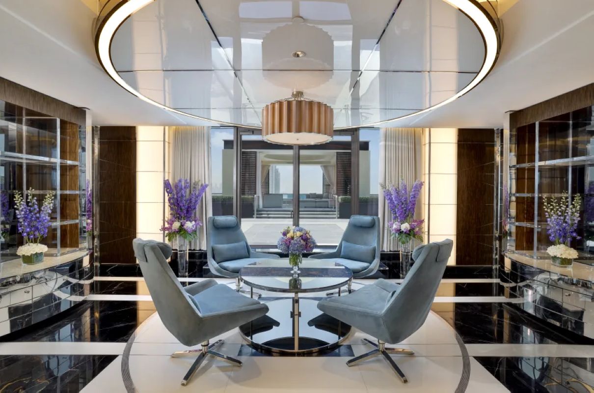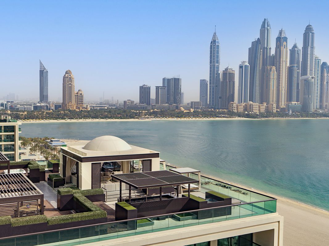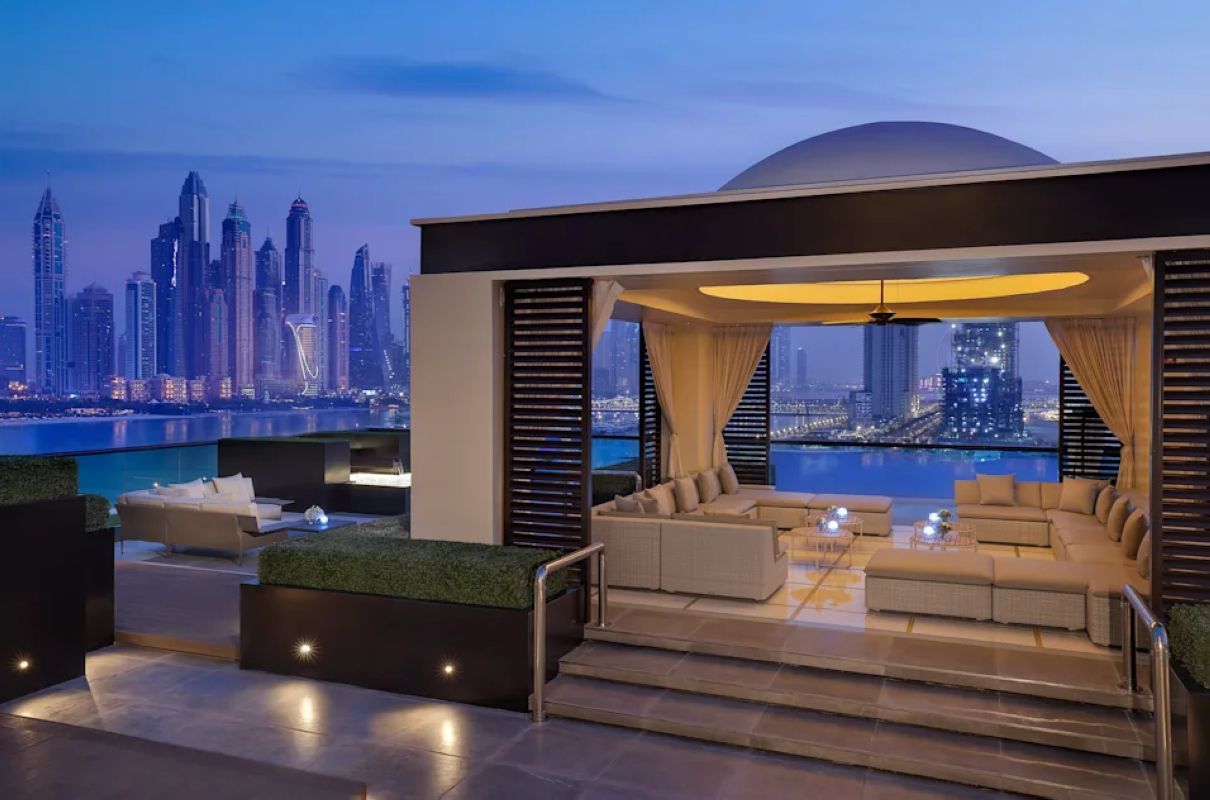 2 спальни с двуспальными кроватями king-size, 2 ванные комнаты с ванной и душем, 2 гостиный комнаты, кухня, гардеробная, сауна, терраса с баром и джакузи, вид на залив, привилегии Executive Lounge.