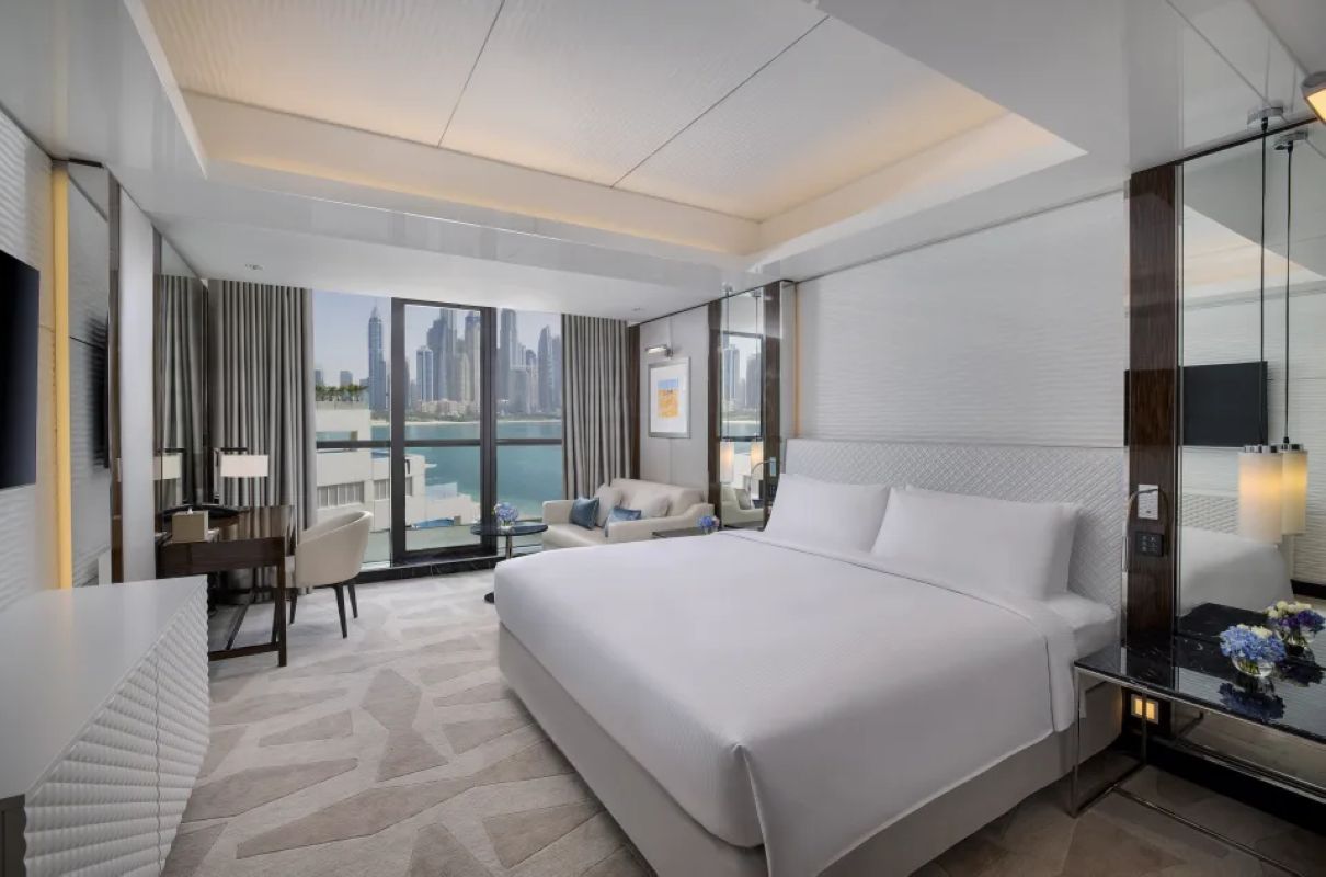 На верхних этажах, спальня с двуспальной кроватью king-size, гостиная комната с диваном и обеденным столом (дополнительная кровать не ставится), ванная комната, балкон, вид на залив, привилегии Executive Lounge;