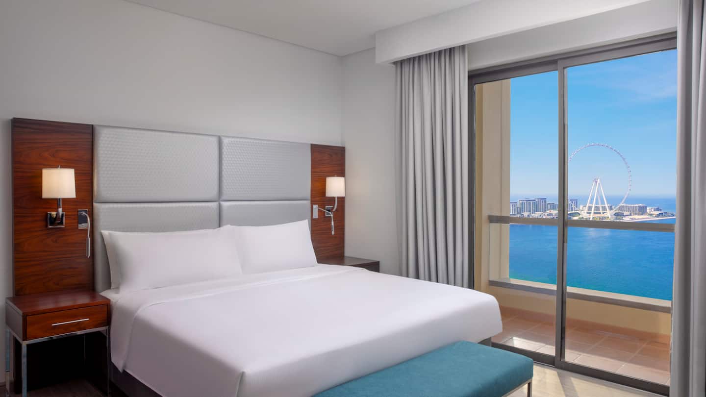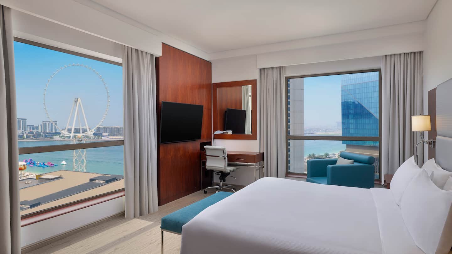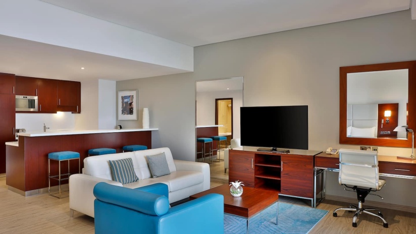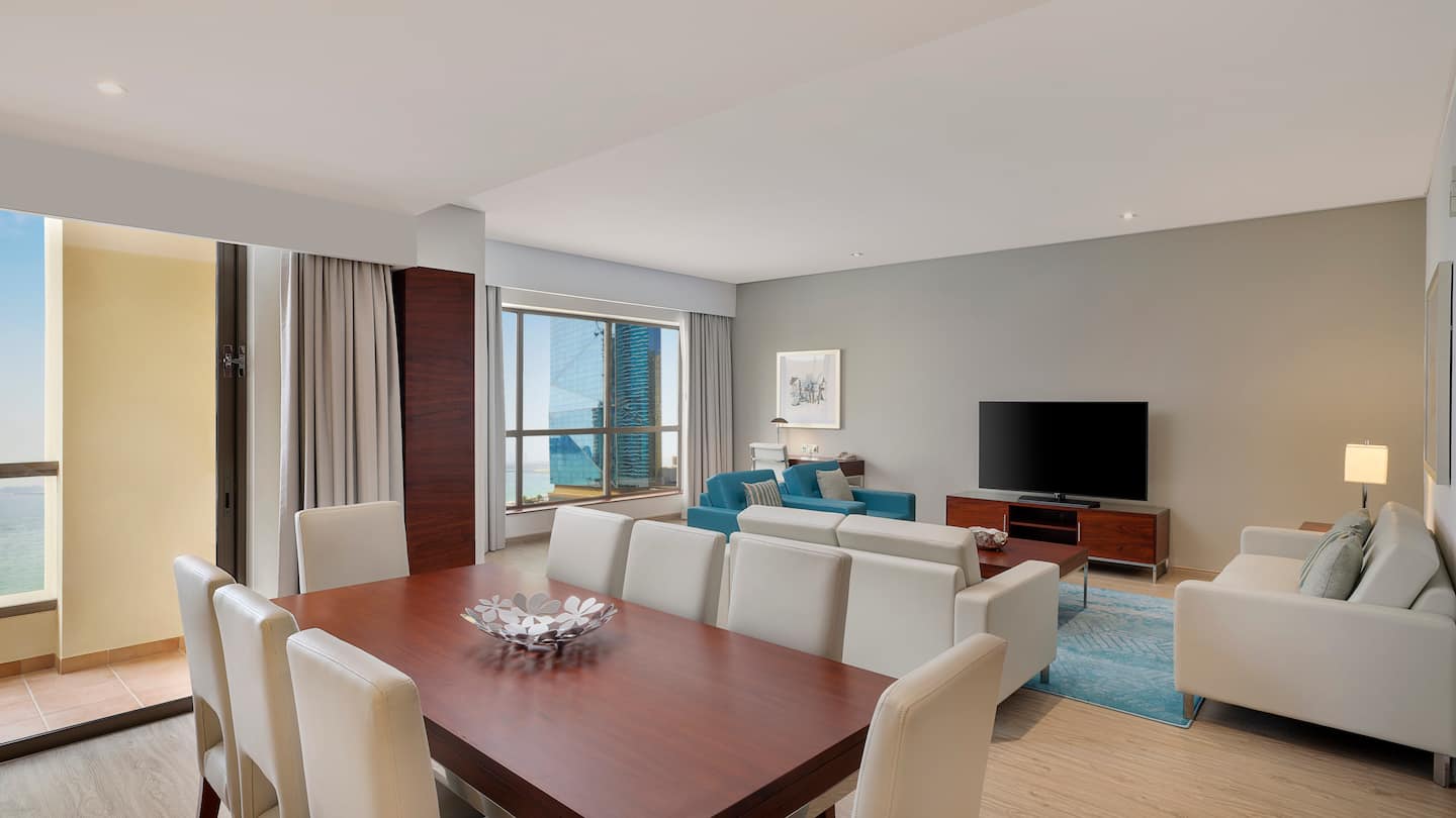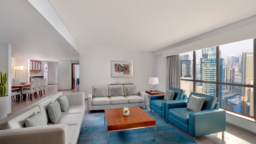 Двухуровневый номер на 42 этаже, спальня с двуспальной кроватью king-size, 2 ванные комнаты, гардеробная, отдельная гостиная комната с диванами и обеденным столом, полностью оборудованная кухня, большие окна, вид на море, доступ в эксклюзивный клуб Executive Lounge.