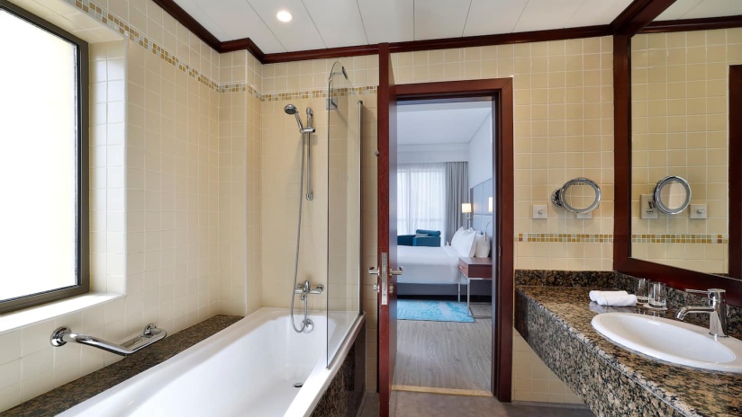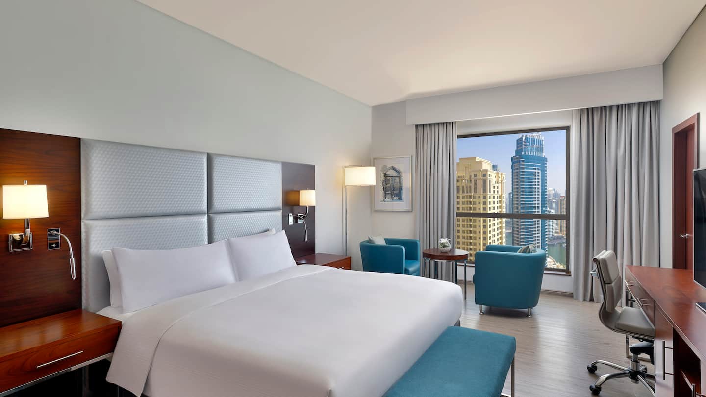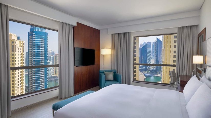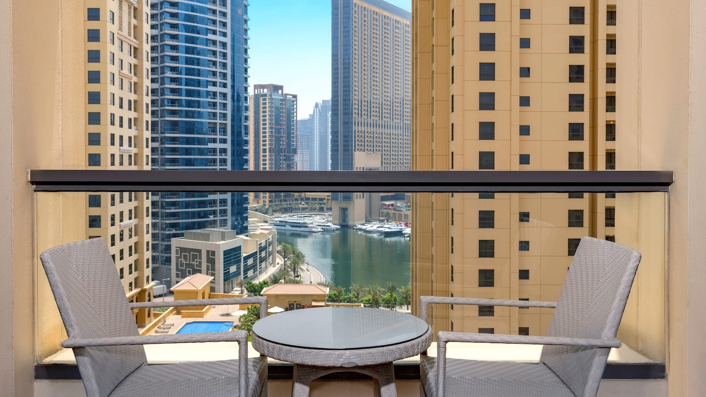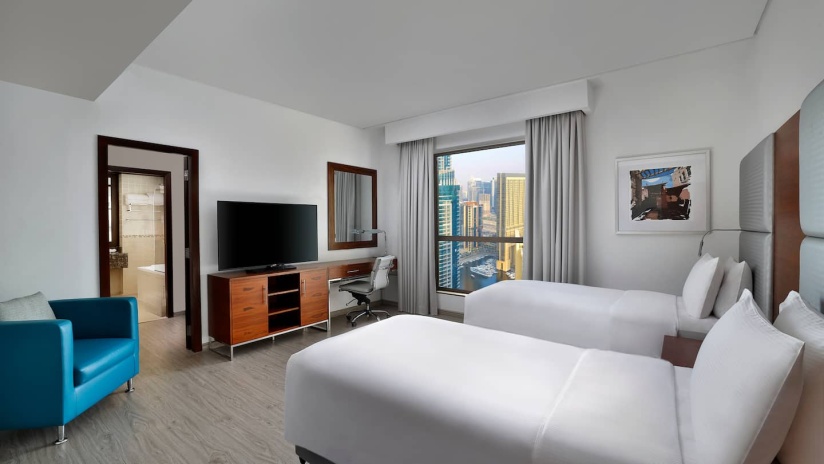 Двухуровневый номер на 42 этаже, спальня с двуспальной кроватью king-size, 2 ванные комнаты, гардеробная, отдельная гостиная комната с диванами и обеденным столом, полностью оборудованная кухня, большие окна, вид на море, доступ в эксклюзивный клуб Executive Lounge.