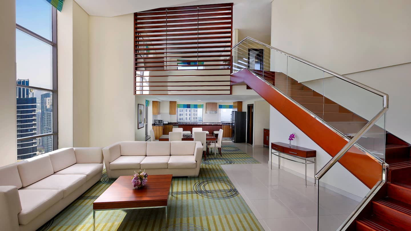 Двухуровневый номер на 42 этаже, спальня с двуспальной кроватью king-size, 2 ванные комнаты, гардеробная, отдельная гостиная комната с диванами и обеденным столом, полностью оборудованная кухня, большие окна, доступ в эксклюзивный клуб Executive Lounge;