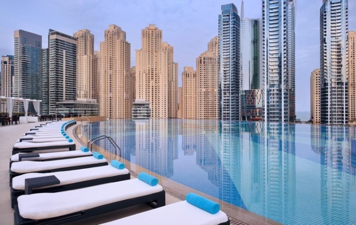Спальня с двуспальной кроватью king-size, отдельная гостиная комната, вид на бассейн и гавань Marina Dubai, эксклюзивный доступ в Lounge Club;