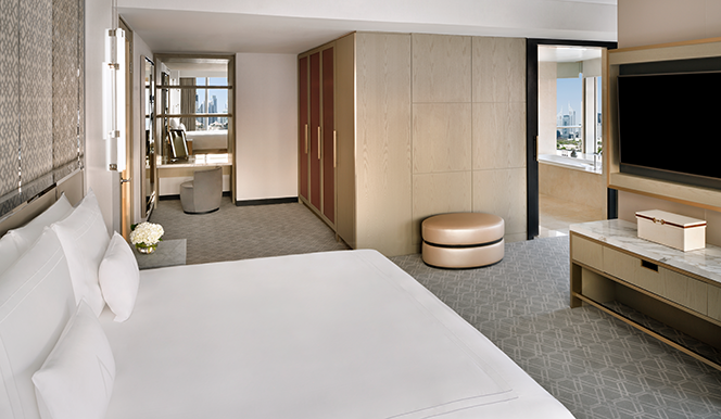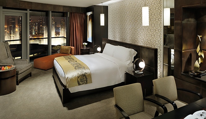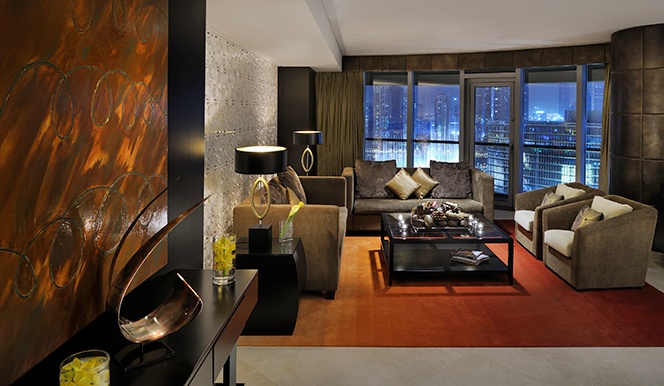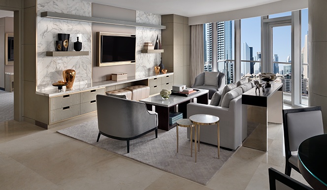 2 спальни: двуспальная кровать king-size и 2 односпальные кровати, отдельная гостиная комната с обеденной зоной и кухней, 2 ванные комнаты с джакузи, балкон, вид на Burj Khalifa, возможно совместить с номером Club (king-size), эксклюзивный доступ в клубный лаунж, трансфер на лимузине в/из международный аэропорт Дубая, бесплатно услуги парковки сотрудником отеля, поздний выезд в 16:00, услуги глажки бесплатно 1 предмет одежды за всё время пребывания.