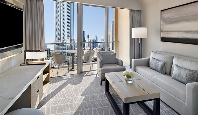 2 спальни: двуспальная кровать king-size и 2 односпальные кровати, отдельная гостиная комната с обеденной зоной и кухней, 2 ванные комнаты (одна из них с джакузи), гардеробная, балкон, вид на Burj Khalifa, эксклюзивный доступ в клубный лаунж, трансфер в/из международный аэропорт Дубая, бесплатно услуги парковки сотрудником отеля, поздний выезд в 16:00, услуги глажки бесплатно 1 предмет одежды за всё время пребывания;