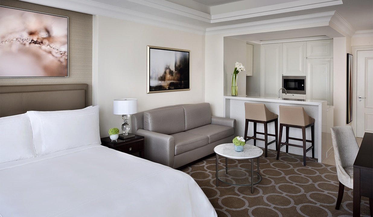 Спальня с двуспальной кроватью king-size, отдельная гостиная комната с диваном с мини-кухней, эксклюзивный доступ в клубный лаунж, завтрак включён;