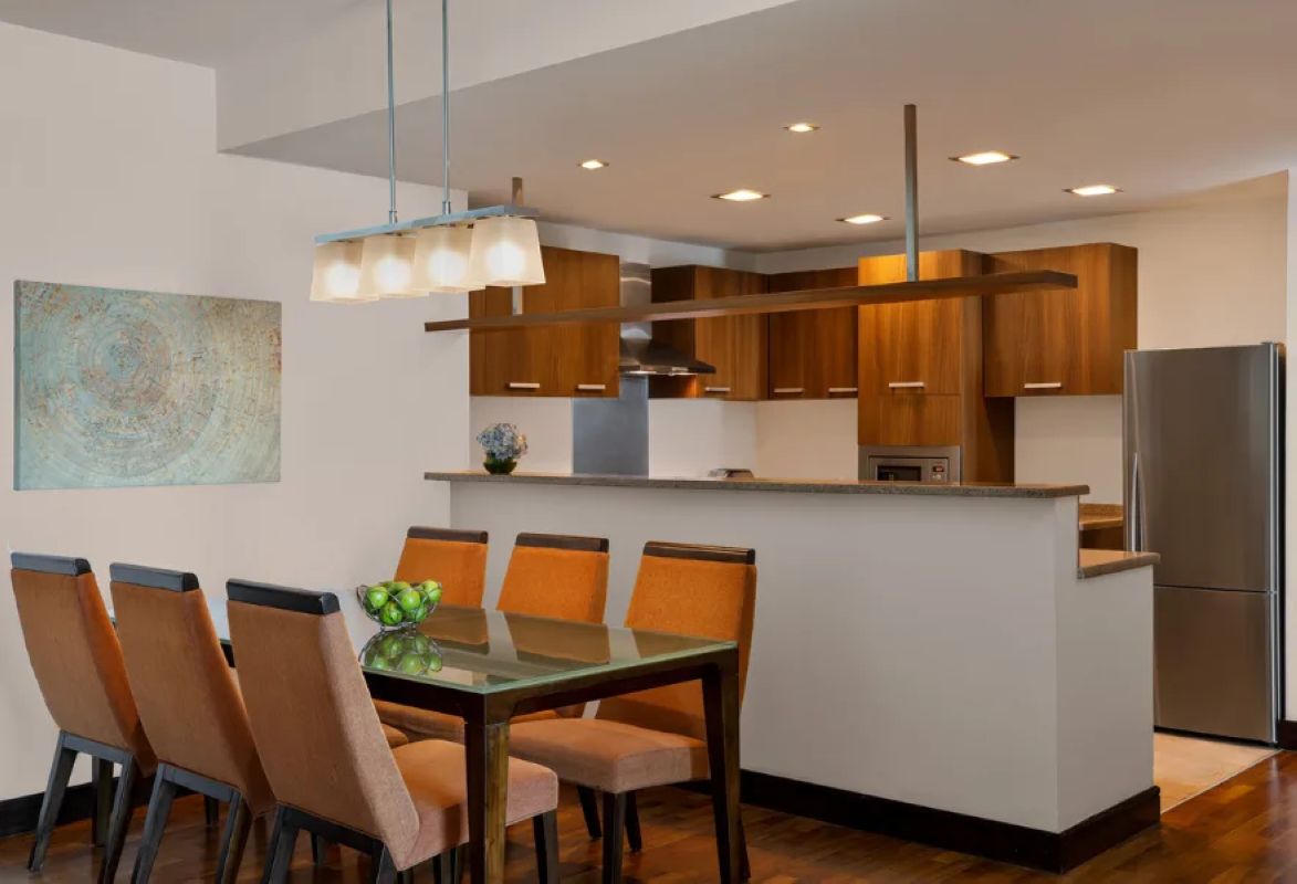 2 спальни: двуспальная кровать king-size и 2 односпальные кровати, отдельная гостиная комната с диваном, обеденным столом и кухней, 2 ванные комнаты, вид на город;
