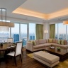 Спальня с двуспальной кроватью king-size, отдельная гостиная комната с диваном, обеденным столом и кухней, ванная комната, балкон, вид на залив;