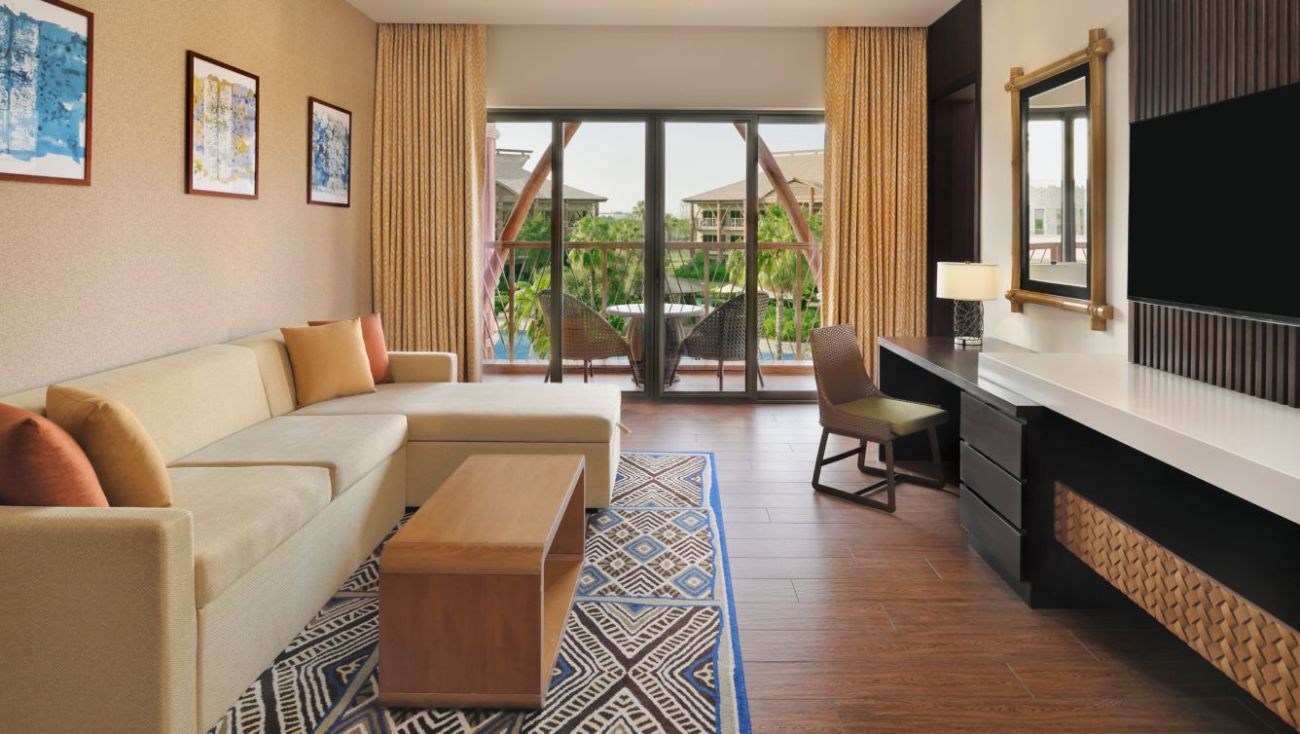 Двуспальная кровать king-size, гостиная зона с диваном, ванная комната, балкон, вид на курорт, посещение парка Dubai Parks and Resorts;