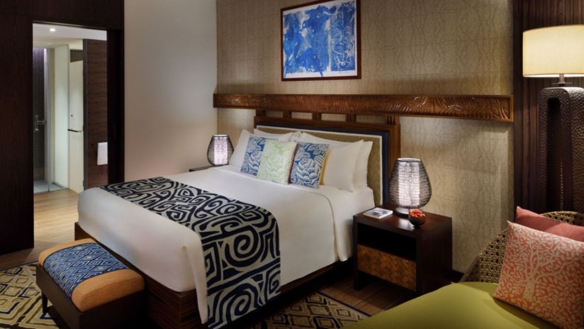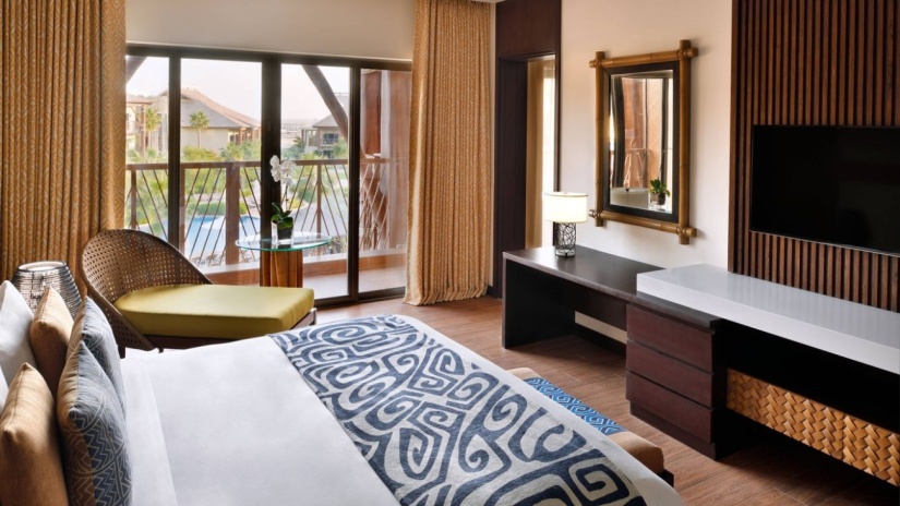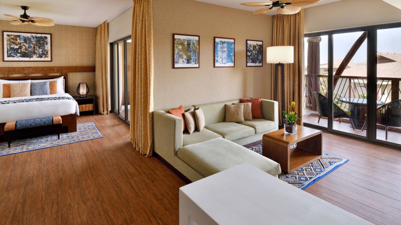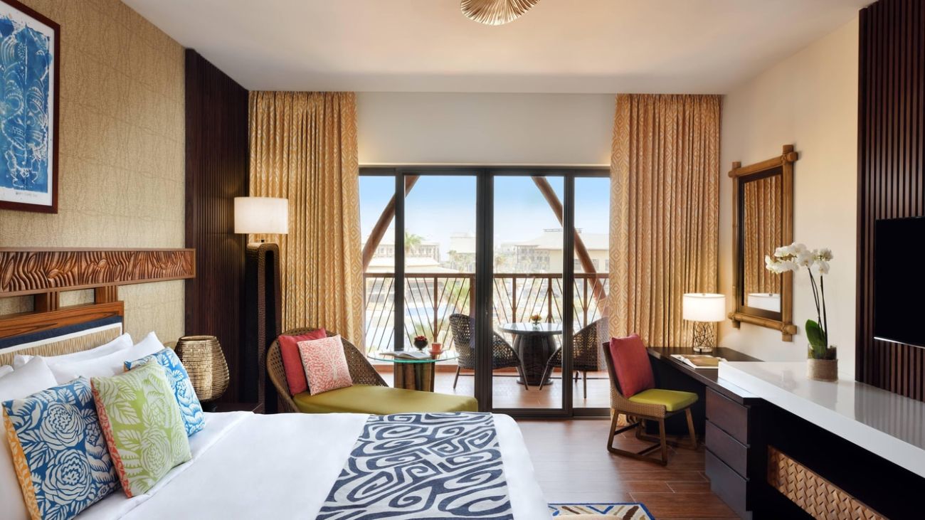 Спальня с двуспальной кроватью king-size, отдельная гостиная комната, ванная комната, балкон, вид на курорт, посещение парка Dubai Parks and Resorts;