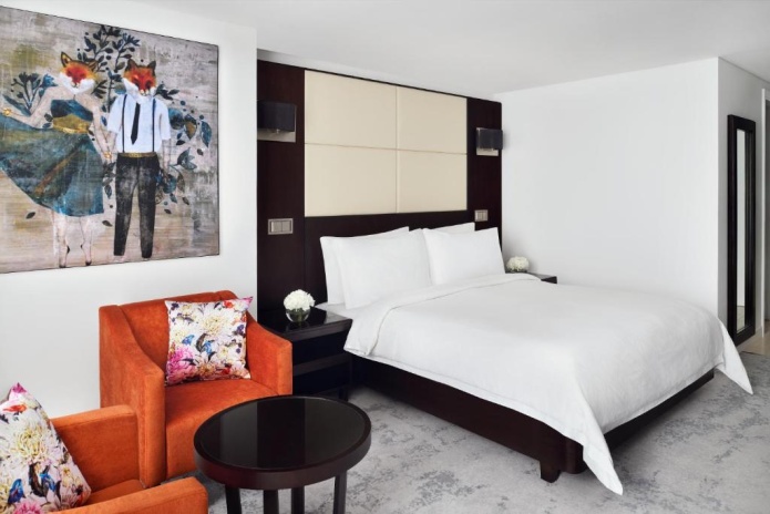 Двуспальная кровать кровать king-size или 2 односпальные кровати, гостиная зона со столиком и креслами, большие окна, ванная комната с ванной и душем, вид на город;