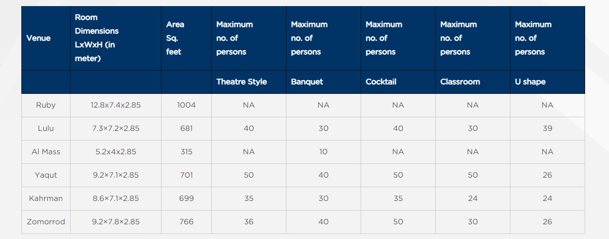 • 8 конференц-залов: банкетный зал Fairouz (236 м²) на 200 гостей (банкетный зал может быть поделён на 2 зала), 6 конференц-залов вместимостью от 10 до 50 человек - см.характеристики залов;