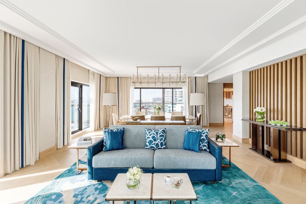 Номер располагается на 4-м этаже, спальня с двуспальной кроватью king-size, гостиная комната с диваном-кроватью, обеденной зоной и оборудованной кухней, ванная комната, гостевой туалет, терраса, джакузи на террасе, вид на море, доступ в эксклюзивный лаунж-клуб Taj;
