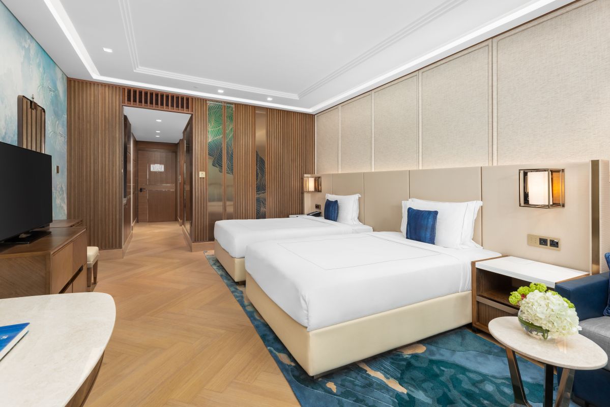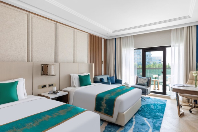 Каждый номер оформлен в золотисто-синих тонах, двуспальная кровать king-size (206 х 206 см) или 2 односпальные кровати (140 х 200 см), диван-софа, ванная комната с ванной и душевой кабиной, балкон, вид на территорию курорта (в номерах с кроватью king-size раскладной диван - 120 х 190 см, в номерах twin раскладной диван - 90 х 190 см);