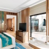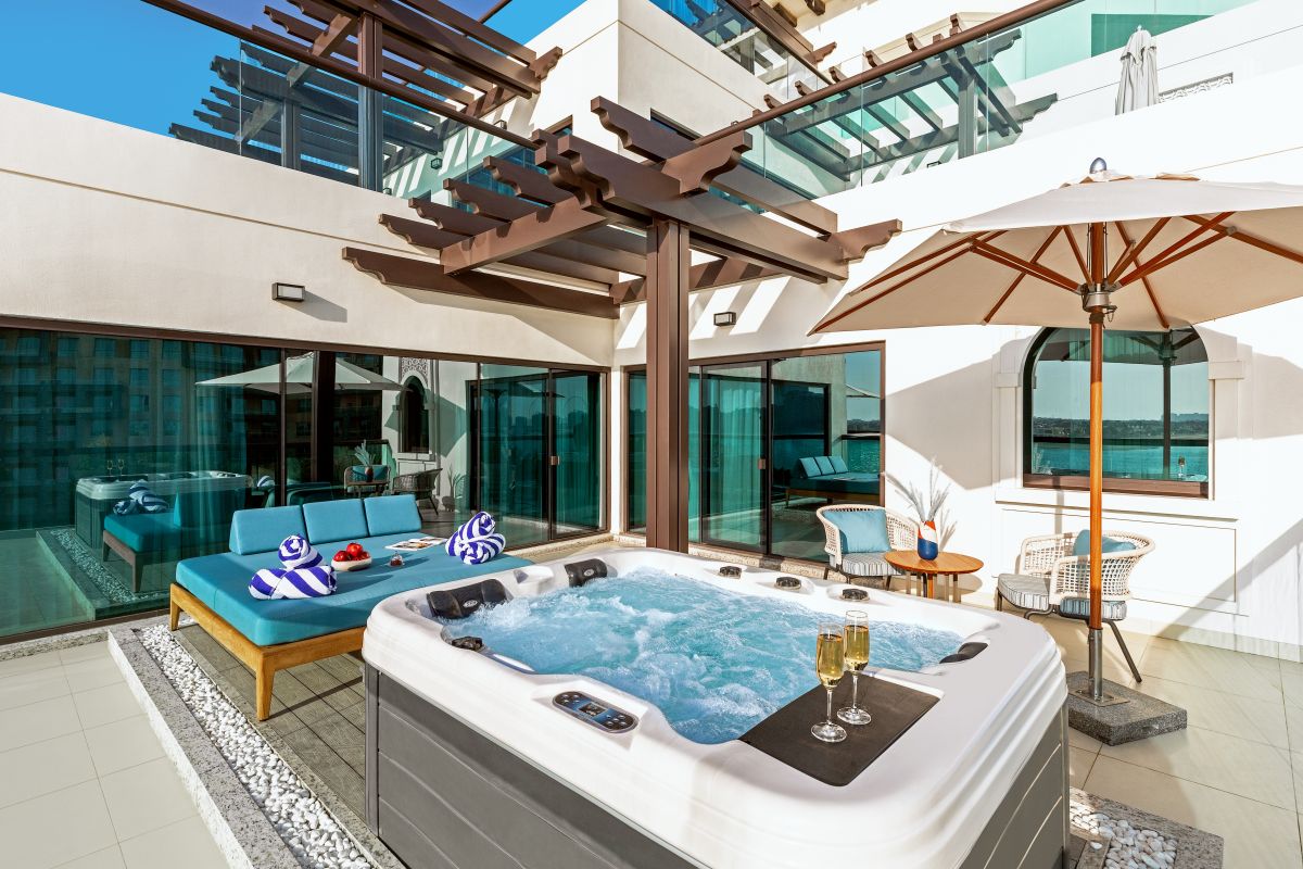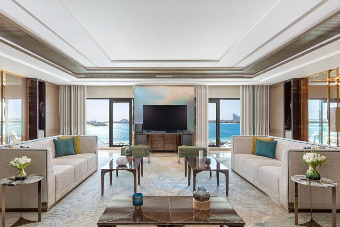 Номер располагается на 3-м этаже, спальня с двуспальной кроватью king-size, гостиная комната с диваном-кроватью, обеденной зоной и оборудованной кухней, ванная комната, гостевой туалет, терраса, джакузи на террасе, вид на море, доступ в эксклюзивный лаунж-клуб Taj;