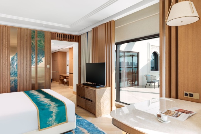 Спальня с двуспальной кроватью king-size, гостиная, раскладной диван - 150 х 190 см, гардеробная, ванная комната, балкон, вид на море, доступ в эксклюзивный лаунж-клуб Taj;