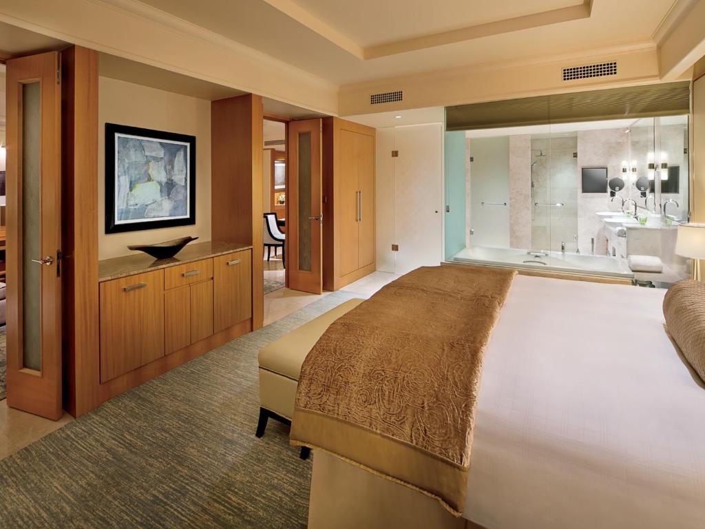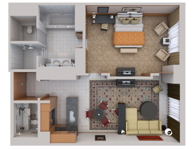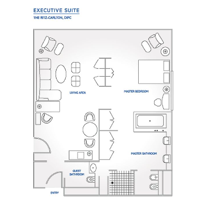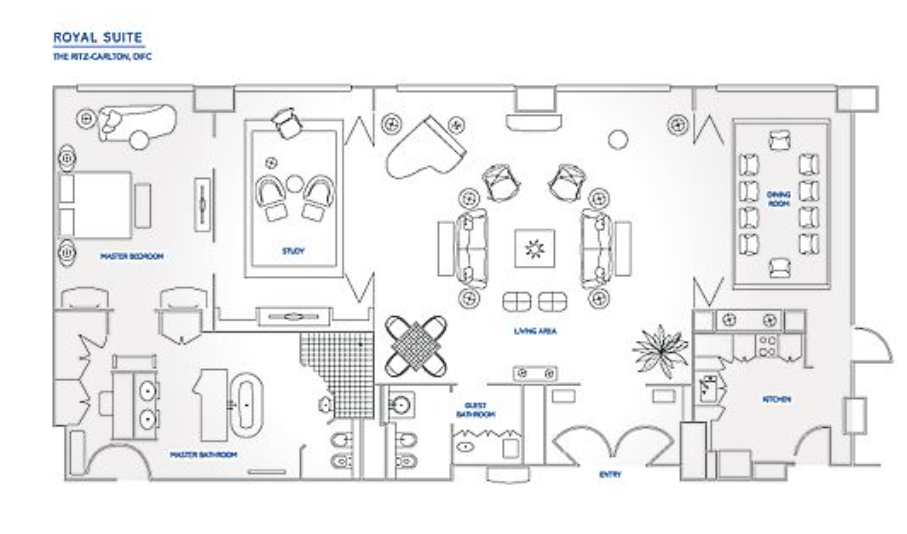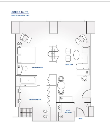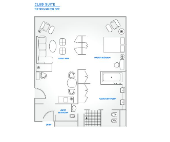 Номера расположены на 10-14 этажах, спальня с двуспальной кроватью king-size, отдельная гостиная комната с обеденной зоной, ванная комната с ванной и душем, гостевая ванная комната, доступ в клубный лаунж, план номера;
