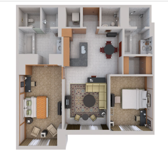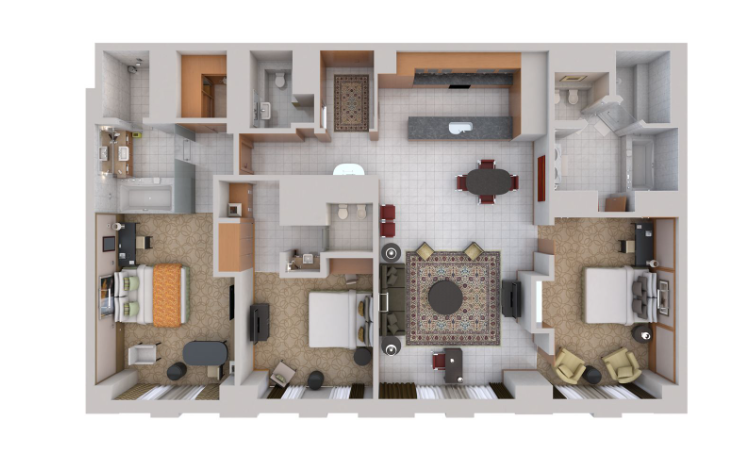 3 спальни: двуспальная кровать king-size и 2 двуспальные кровати queen-size, 3 ванные комнаты, гостевой туалет, отдельная гостиная комната с обеденной зоной и кухней, план номера.