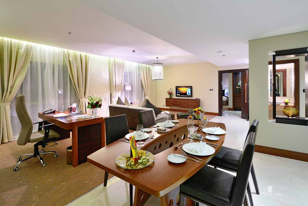 Спальня с двуспальной кроватью king-size, отдельная гостиная комната с диваном, обеденным столом и письменным столом, ванная комната с ванной и душем, гостевой туалет, вид на городской пейзаж,  Jumeirah и башню Бурдж-Халифа;