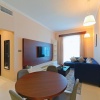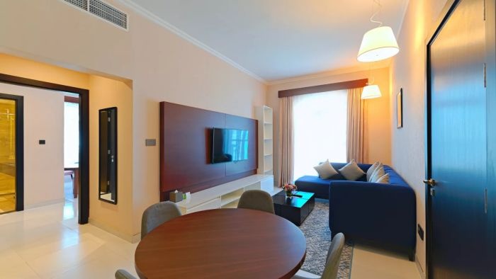 Спальня с двуспальная кровать king-size, отдельная гостиная комната с диваном и обеденным столом, ванная комната с ванной и душем, вид на город.