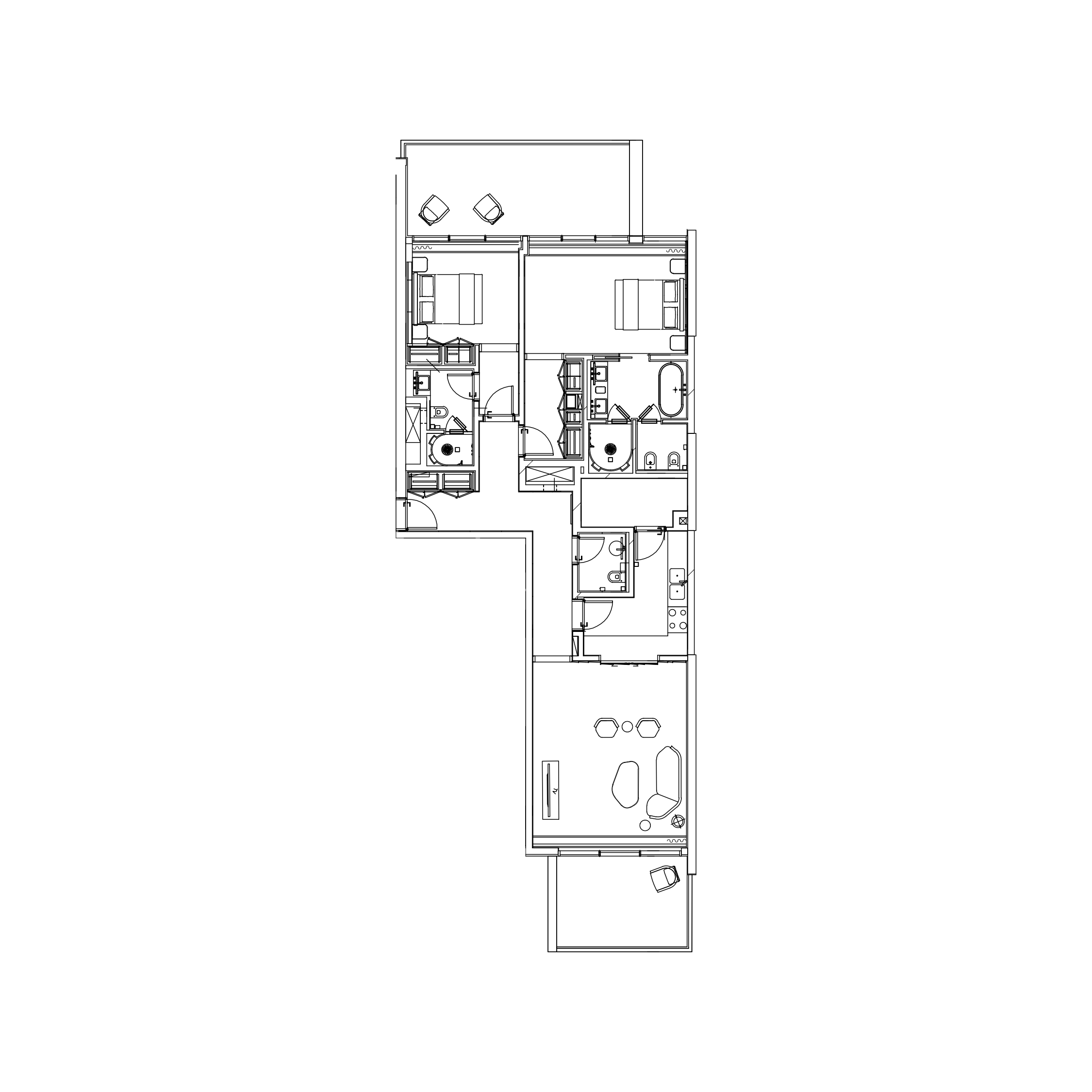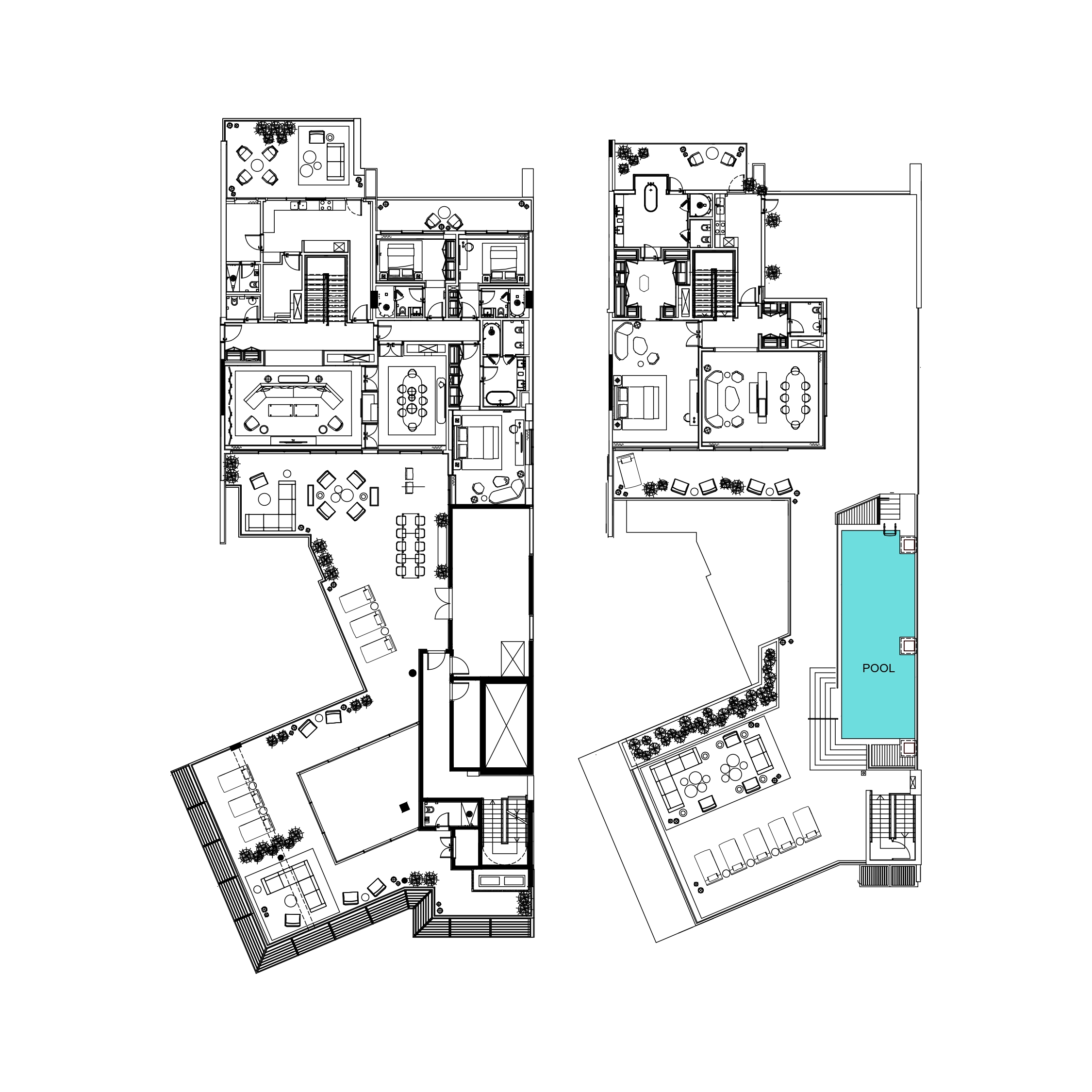 Двухэтажный номер, 4 спальни с двуспальными кроватями king-size, гостиная комната с диваном, кухней, гостевой туалет, 2 гардеробные, терраса, персональный бассейн, джакузи, см. план номера 1, см. план номера 2;