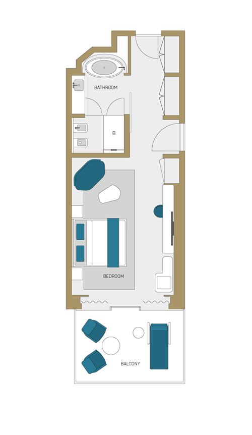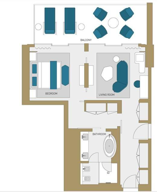 Спальня с двуспальной кроватью king-size, гостиная комната с диваном, ванная комната с ванной, окна от пола до потолка, меблированный балкон, вид на залив, см. план номера;