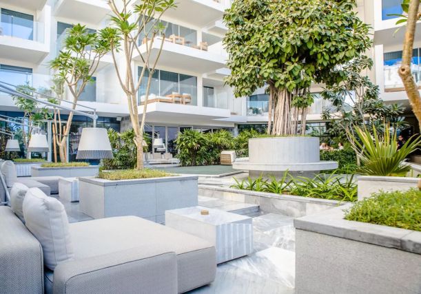 Дизайн FIVE Palm Jumeirah был создан штатным архитектором Набилом Акики, гостей встречает стеклянный куб размером 15 на 15 метров, открывающий захватывающий вид на бассейн, море и горизонт с самого входа.