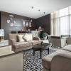 Спальня с двуспальной кроватью, отдельная просторная гостиная комната с диваном, обеденным и письменным столом, ванная комната,  за большими окнами открываются захватывающие дух городские пейзажи.