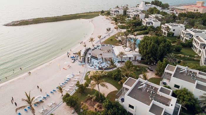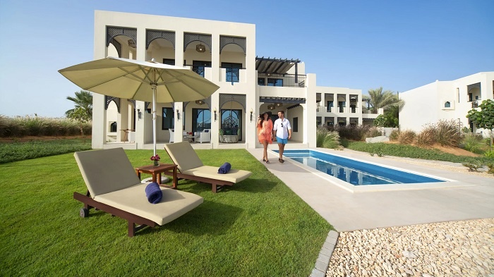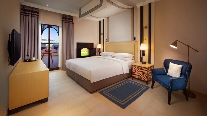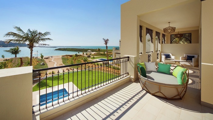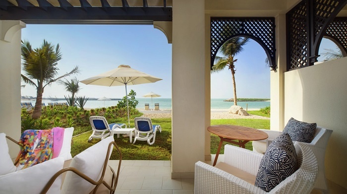 Номера расположены на виллах у пляжа, на нижнем этаже, 2 двуспальные кровати queen-size, гостиная зона с креслами, ванная комната с ванной и душем, меблированная терраса, вид на Персидский залив;