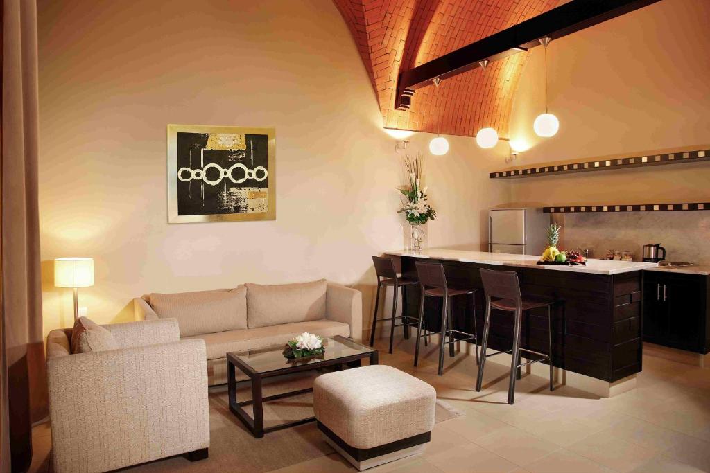 Двухуровневая вилла, 2 спальни с гостиными зонами (двуспальная кровать king-size и 2 односпальные кровати), отдельная гостиная комната с диваном и обеденной зоной с барной стойкой, 2 ванные комнаты с душем, терраса, частный бассейн, вид на Персидский залив;
