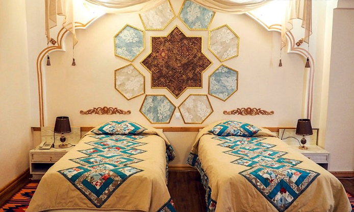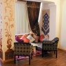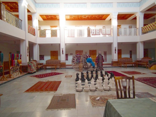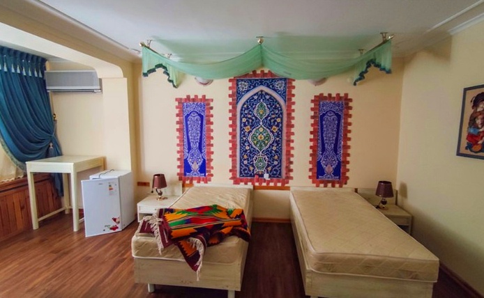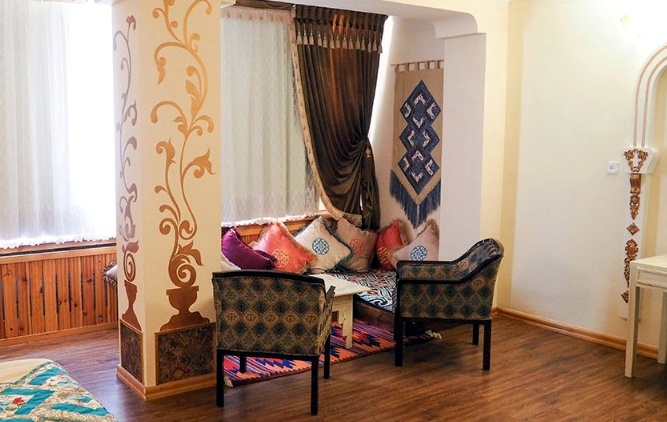 Просторные, светлые номера с национальным декором оснащены всеми необходимыми удобствами для отдыха, есть ресторан хорезмской кухни, персонал отеля работает круглосуточно.